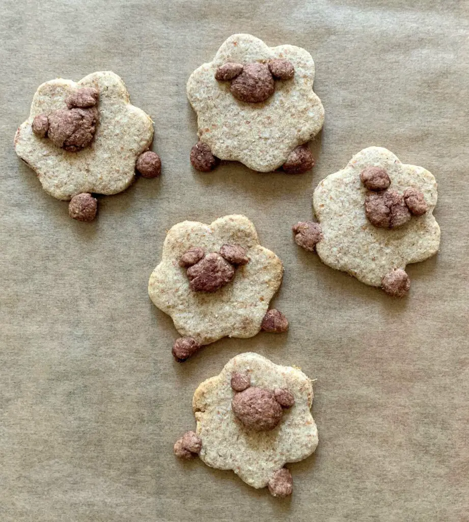 Nun rollt ihr den hellen Teig aus und stecht die Schäfchen aus. Anfangs sehen sie noch aus wie Blumen, aber mit Kopf, Nase bekommen sie mehr Schafs-Optik!