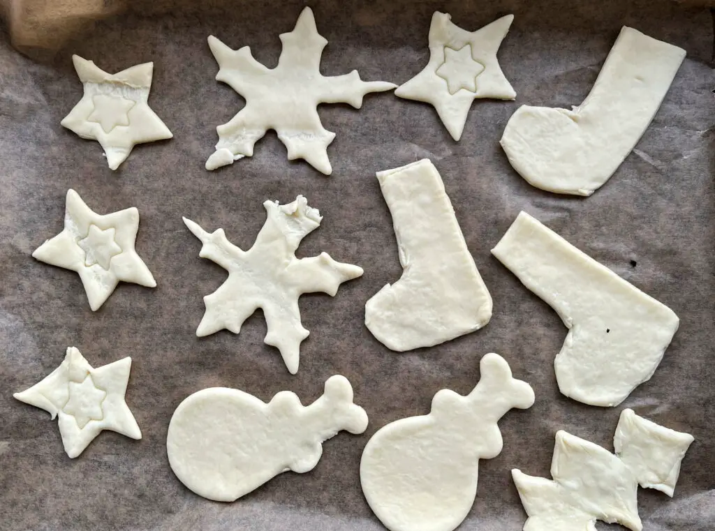Schnappt euch anschließend die Ausstechformen und stecht die Motive aus dem Teig. Wenn ihr keine habt, könnt ihr sie auch mit einem Messer ausschneiden. Ich hatte beispielsweise keine Ausstechform für eine Weihnachtstanne oder Weihnachtssöckchen, sondern die Formen einfach mit einem Messer ausgeschnitten. Falls euch das nicht so gut frei aus der Hand gelingt, könnt ihr vorher auch eine Schablone aus Pappe darauf legen!