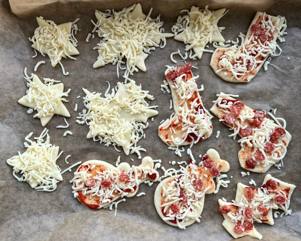 Drapiert eure weihnachtlichen Pizzastücke auf ein Backblech, beträufelt die Oberfläche mit einer Prise Käse, und wenn ihr wollt, könnt ihr sie noch mit Toppings dekorieren!
