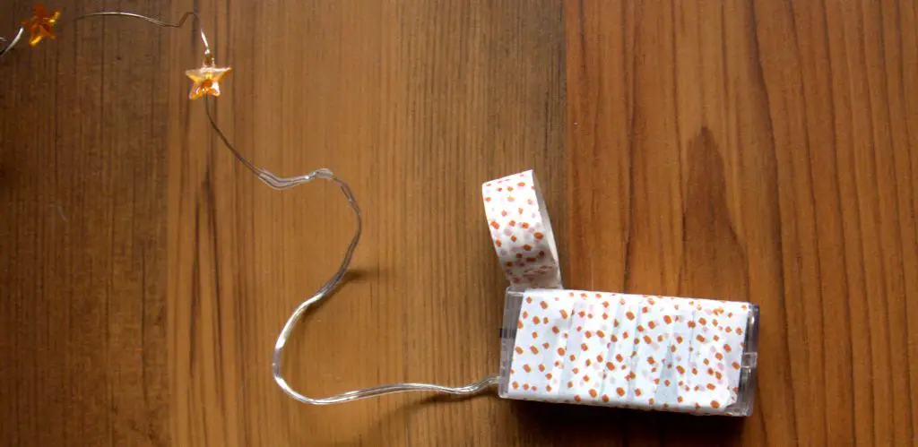 Nun nehmt ihr euch die Lichterkette. Falls sie bei euch ähnlich wie bei mir ein recht großes Gehäuse hat, dann könnt ihr auch sie mit etwas Washi Tape verzieren. Falls sie Batterien enthalten, müsst ihr diese natürlich vorher rein legen.