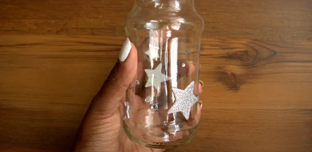 Als nächstes nehmt ihr das Glas und verziert es nach euren Vorlieben. Ich habe mich für silberne Sterne und funkelnden Strass entschieden!